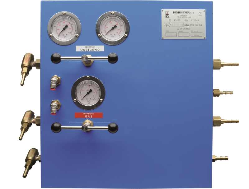 L’unité de contrôle de régulation de gaz et de décompression est installée à proximité de la machine de flammage. L’unité de contrôle est équipée de deux réducteurs de basse pression 451, un pour le tuyau d’oxygène et un pour le tuyau de propane, ainsi que de quatre vannes à pression d’air qui contrôlent, conjointement avec le boîtier de contrôle électronique M0093 « AIR TECNO », la flamme pilote, la flamme principale et l’eau de refroidissement du chalumeau.