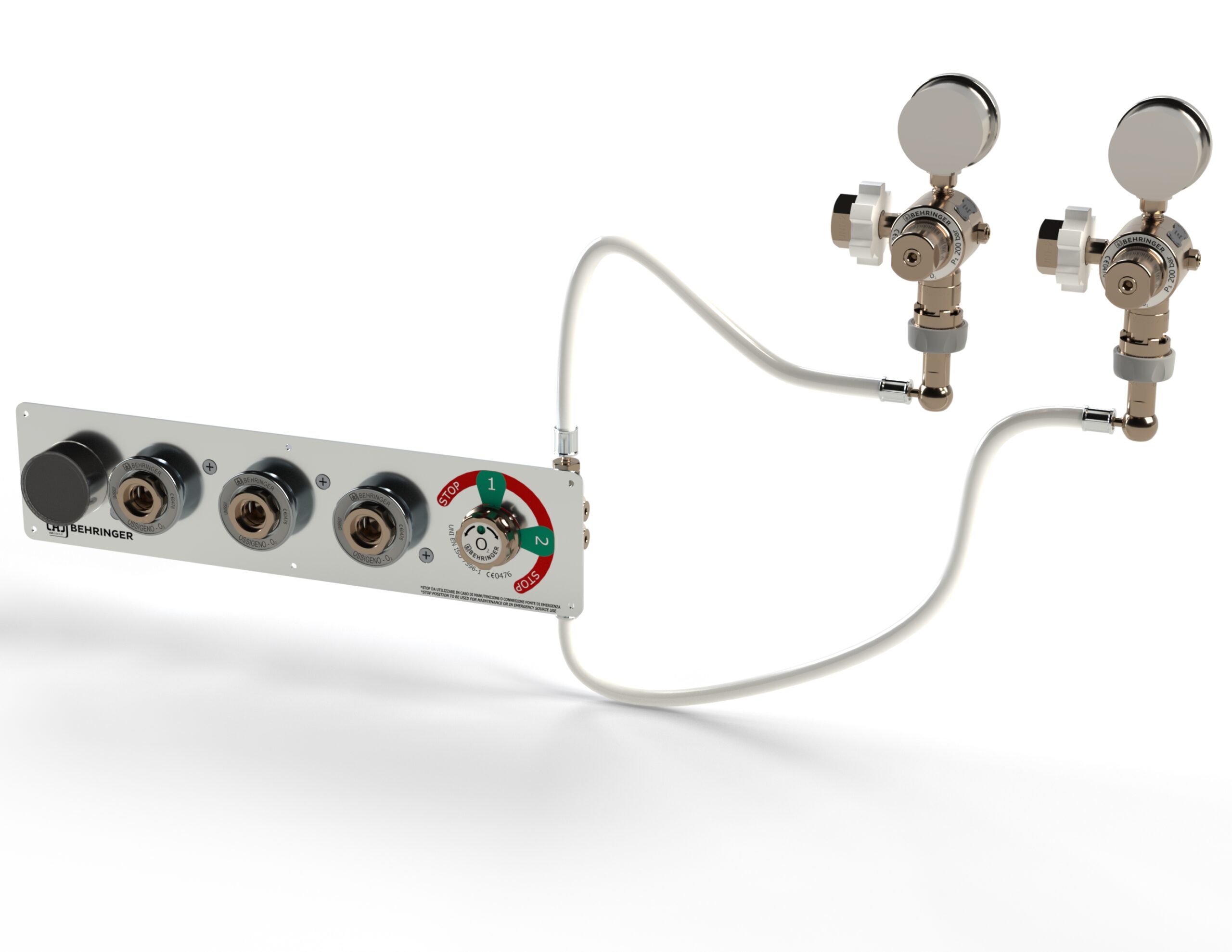 Oxygen distribution system for emergency vehicles, consisting of two cylinder reducers, two or three terminal units model UNI or AFNOR on a single block that can be in 2 versions in line or compact, complete with line pressure gauge, manual or automatic reverser for switching between I and II source; complete with silk-screen-printed aluminium plate for wall mounting; it is classified as a Medical Device in accordance with Regulation (EU) 2017/745 (MDR) active in class IIb; the system meets all the requirements indicated by the reference standards for medical gas distribution systems; simple system adaptable to any model of emergency vehicle. All components are assembled together by means of flexible low-pressure connections in accordance with UNI EN ISO 5359.
