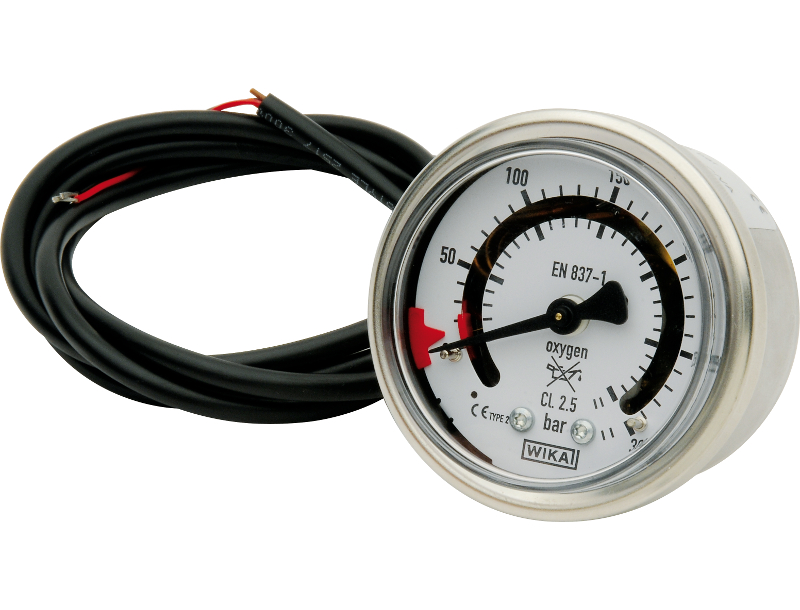 Jauge de pression à contact électrique, classe 2.5. Lorsque la pression tombe sous le seuil de 15 bars, le dispositif envoie un signal au système d’alarme auquel il est relié. Boîtier du cadran de 50 mm de diamètre en acier inoxydable et raccord nickelé. Contact électrique : normalement ouvert. Indice de protection IP65. Tension de commutation : 4,5 – 24 VCC/CA. Courant de commutation : 5-100 mA. Raccordement électrique : Ub+ rouge, SP1 noir.
