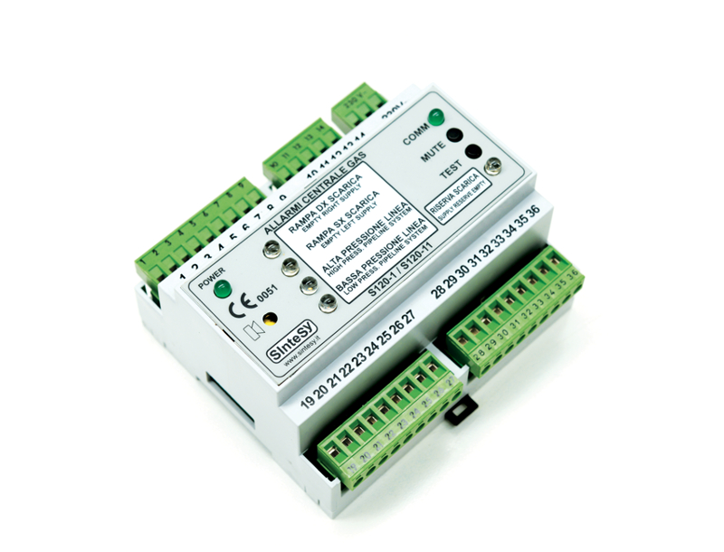 Le module de surveillance des alarmes SINTESY S120 permet de surveiller les alarmes au sein des systèmes de distribution de gaz de qualité alimentaire. Le dispositif peut être installé sur des rails DIN (type DIN 43880) conformes à la norme EN 60715. L’alarme peut être utilisée de manière autonome ou en tant que dispositif d’un réseau comprenant d’autres modules d’alarmes reliés à un bus RS485 fourni en standard. Le dispositif comprend 9 entrées, normalement connectées à des manomètres à contact, opto-isolés pour garantir une immunité au bruit élevée. Il est possible de configurer les canaux sur Normalement fermé (NF) ou Normalement ouvert (NO) ; généralement les contacts des manomètres doivent être fermés.
