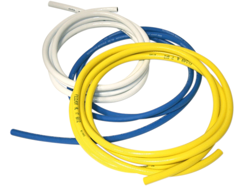 Tuyau en caoutchouc médical, conforme à la norme ISO 5359, formé de cinq couches: la plus interne est en PVC antistatique, à l’extérieur, nous trouvons une couche de PVC qui est contenue dans une couche de polyester qui remplit une fonction de renforcement, les deux dernières couches sont à nouveau en PVC et le plus externe des deux est coloré spécifiquement en fonction du gaz utilisé.