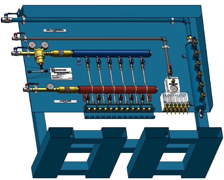 L’unité de gaz combustible comprendun clapet à bille, une soupape de sécurité NESPLON/7, un distributeur doté desix sorties toutes munies d’une vanne à billes d’arrêt, et une soupape desécurité NESPLON/7 pour prévenir les explosions et l’inversion du flux de gaz. L’unité d’oxygène comprend également un clapet àbille, un régulateur de pression 451 en entrée d’un distributeur doté de six points d’alimentation tous muni d’une vanne à billesd’arrêt, et une soupape de sécurité NESPLON/7 pour prévenir les explosions et l’inversion du flux de gaz.