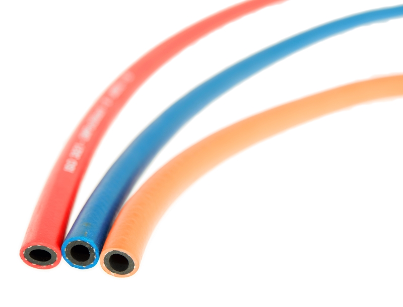 Tuyau souple en caoutchouc pour l’oxygène et les gaz combustibles. Il se compose d’inserts de renforcement textiles robustes en caoutchouc synthétique inerte lisse et d’un revêtement en caoutchouc synthétique lisse. Il est coloré selon le type de gaz utilisé, et résiste aux agents atmosphériques et au vieillissement.