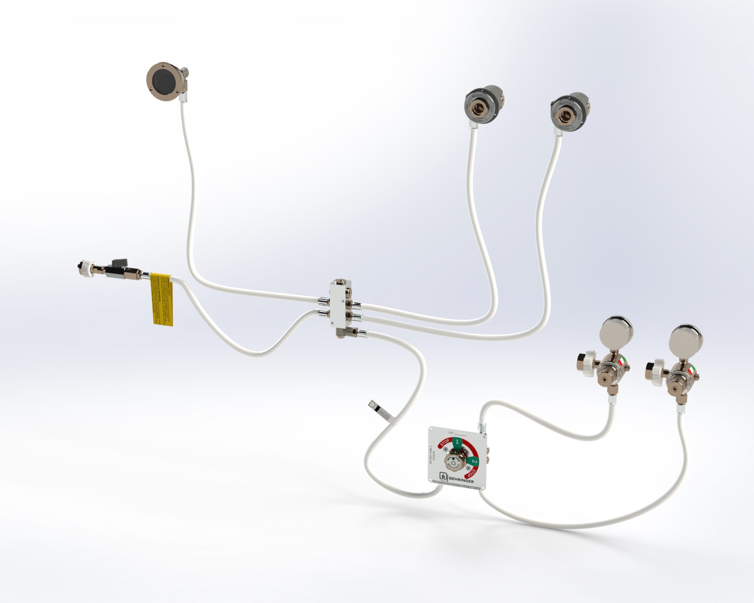 A complete system for the distribution of oxygen in free-standing emergency vehicles; the system consists of two HF model pressure reducers complete with manotransducer, an exchanger that can be manual or automatic, UNI or AFNOR model terminal units complete with flanged base for easy panel installation; equipped with predisposition for connection to the third source; classified as a Medical Device in accordance with Regulation (EU) 2017/745 (MDR) active in class IIb; the system meets all the requirements indicated by the reference standards for medical gas distribution systems; simple system adapted to any model of emergency vehicle. All components are assembled together by means of flexible low-pressure connections in accordance with EN ISO 5359.